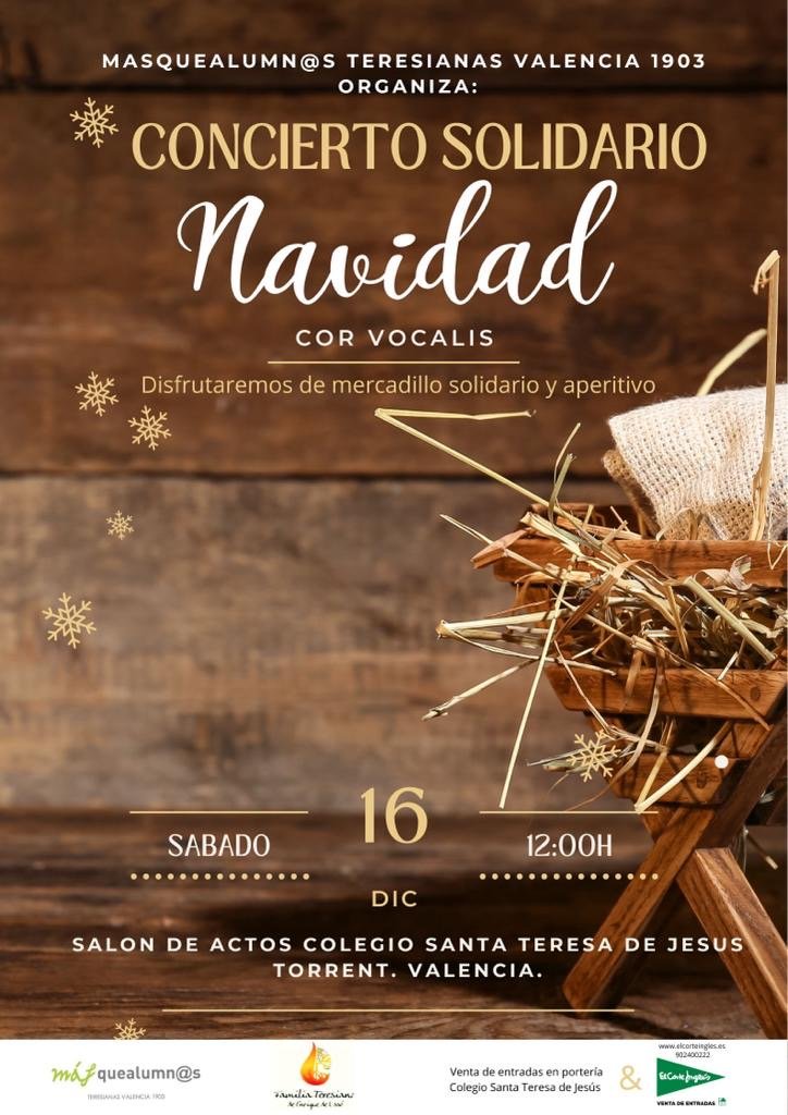El próximo día 16 de diciembre celebraremos el II Concierto Solidario de Navidad, organizado por la asociación de antiguos alumnos “Masquealumnos Teresianas Valencia 1903” junto con la dirección del colegio Santa Teresa de Jesús, en el salón de actos del mismo.